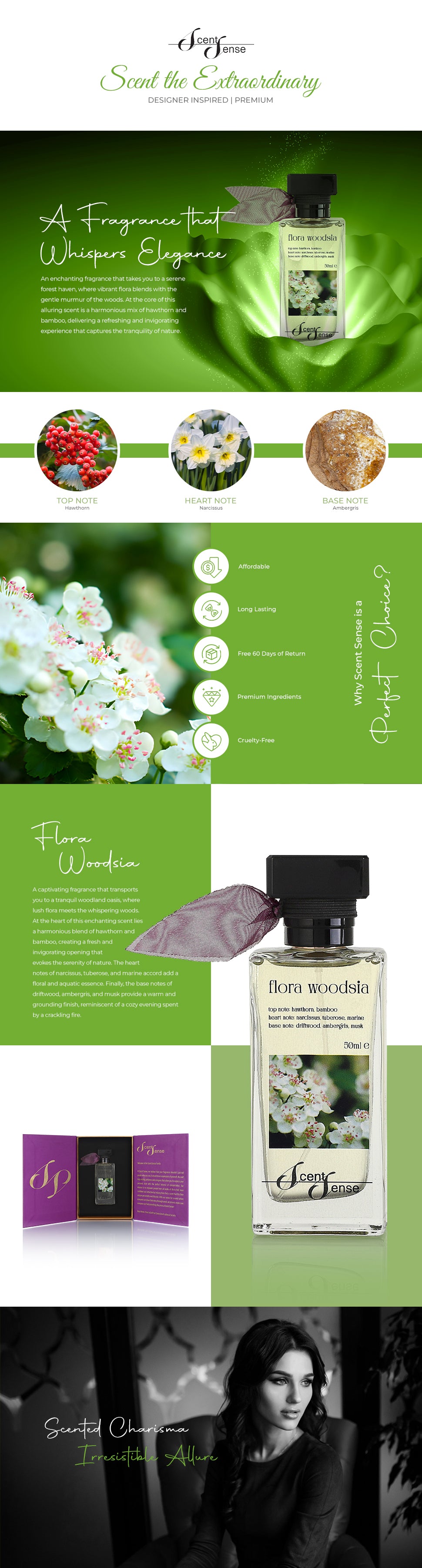 Introducing "Flora Woodsia" – a captivating fragrance that transports you to a tranquil woodland oasis, where lush flora meets the whispering woods.At the heart of this enchanting scent lies a harmonious blend of hawthorn and bamboo, creating a fresh and invigorating opening that evokes the serenity of nature. The heart...